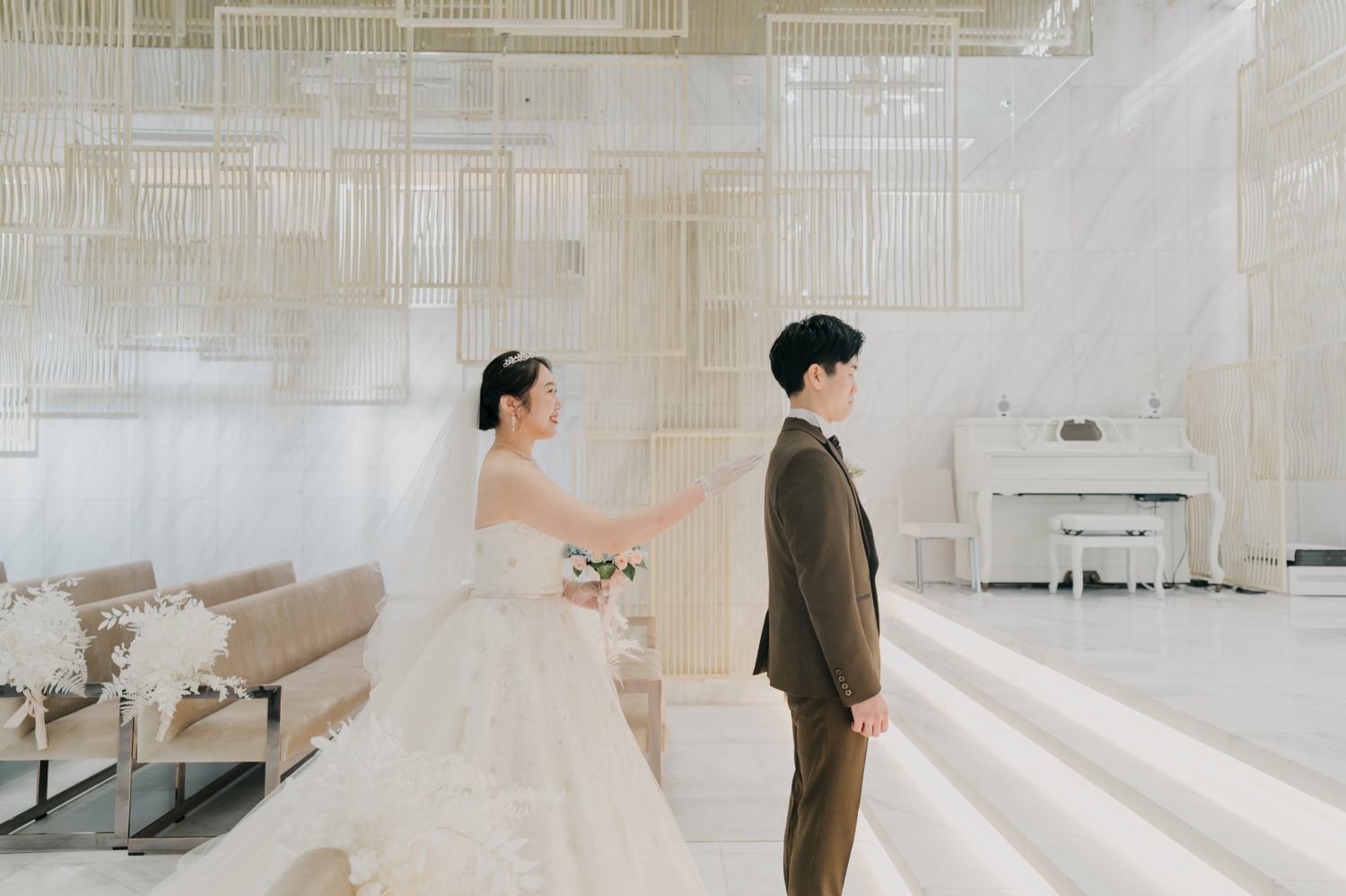 肩をトントンで新郎様が振り返りご対面です